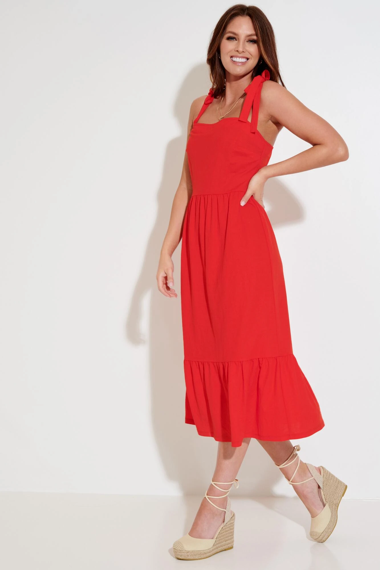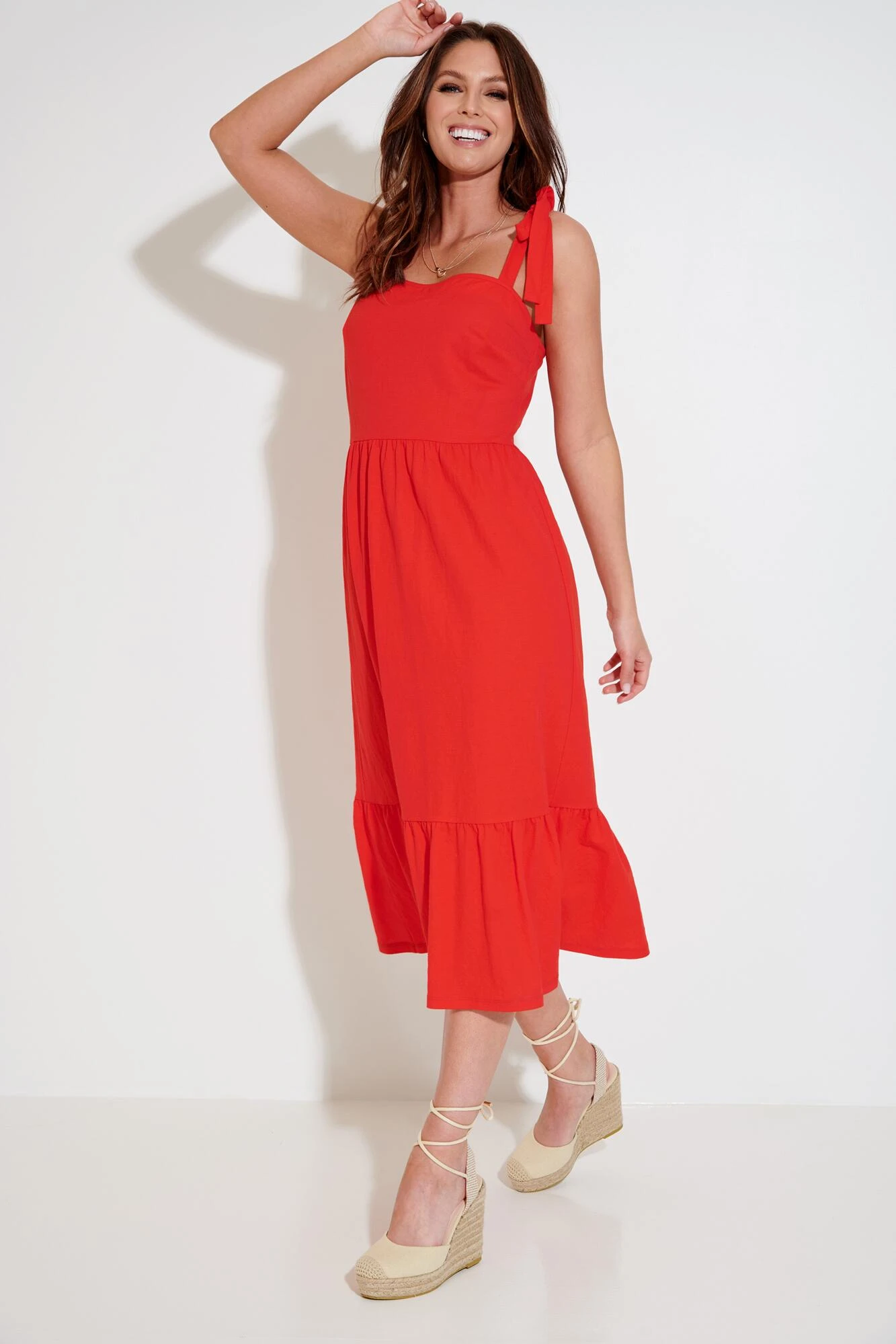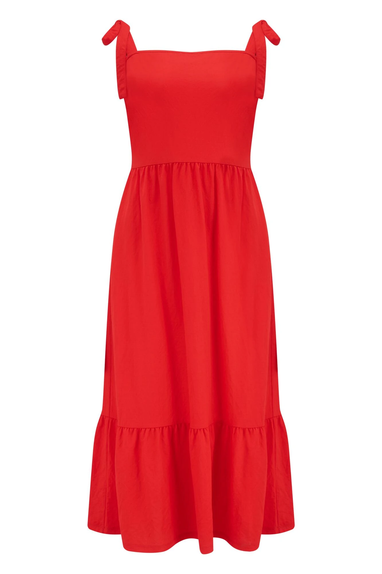Midi dresses are just so easy to wear, but our Laura version makes things even easier. With a cute, tiered skirt and adjustable tie straps at the shoulder, finding your perfect fit is a cinch. And the soft pique jersey fabric feels delicious against your skin, too. Wear with sandals or wedges when it’s warm, but why save this just for the sunshine? The Laura also looks perfect styled with a leather jacket if the weather’s looking a bit British outside.Â
